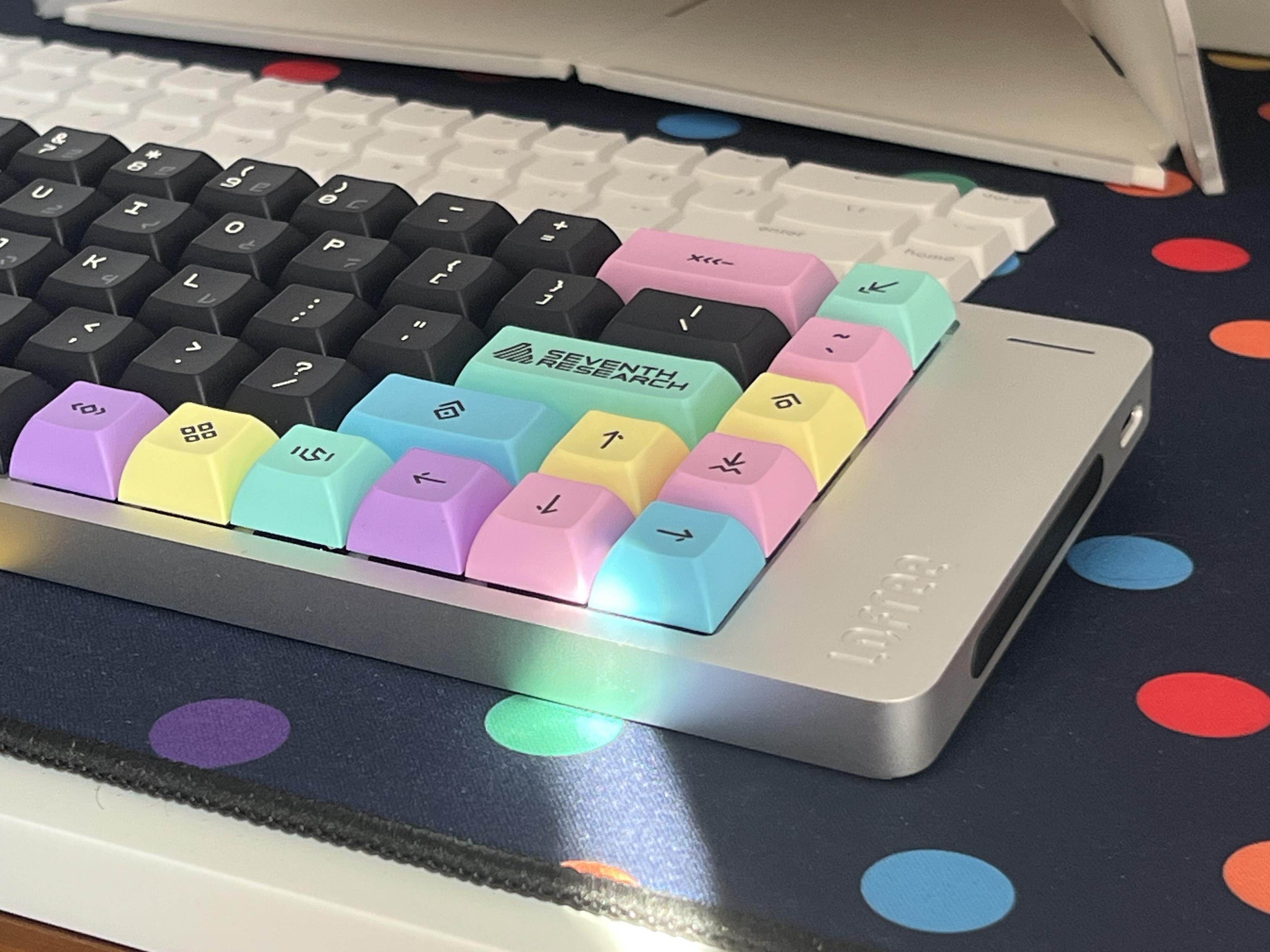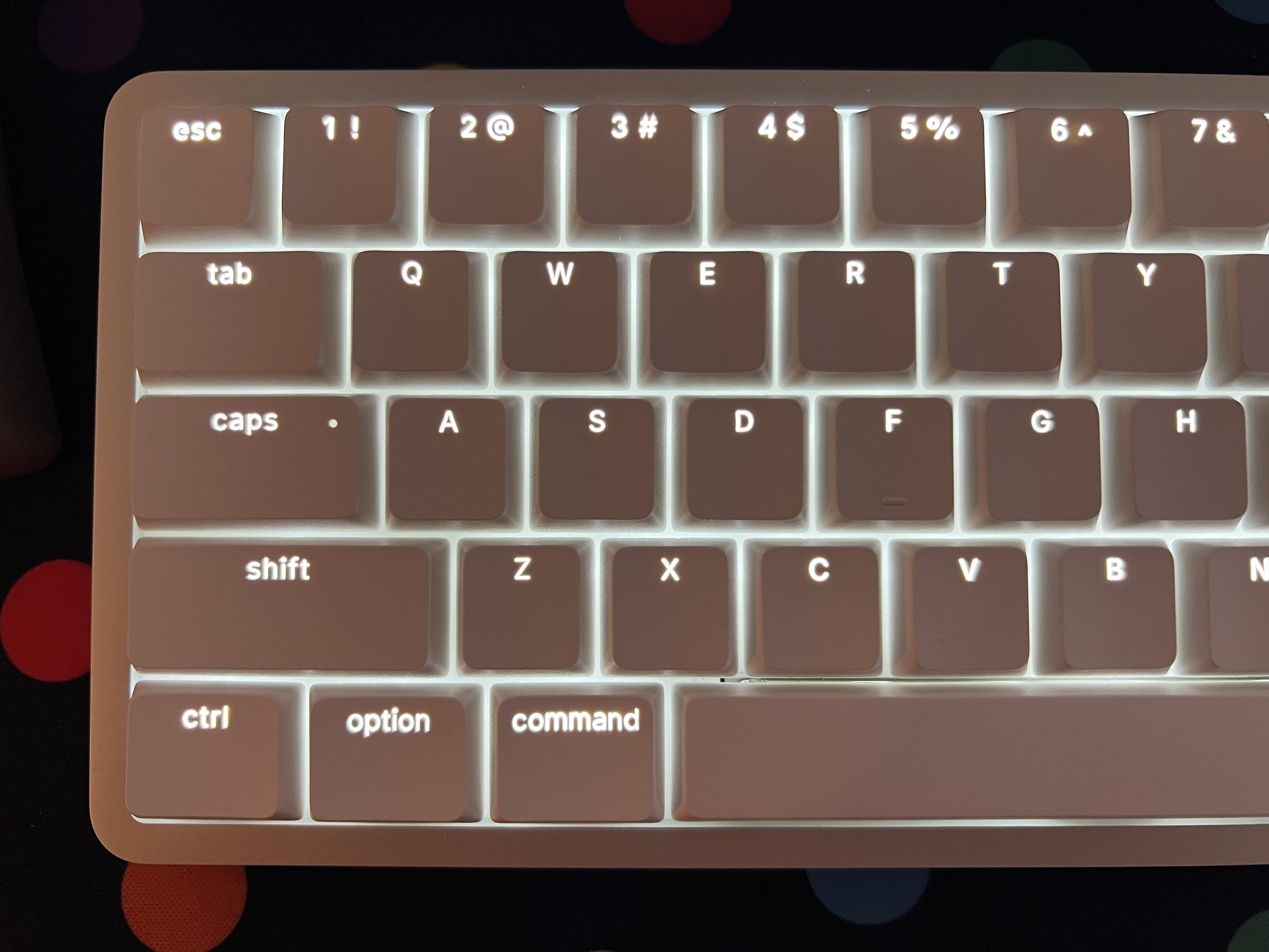 I figured these PBS Aperture Priority keycaps would work well with Flow 2. They’re just the right amount of low profile not to snag on the switches, and feel so much better than the stock caps. Backlight even punches through them a little.