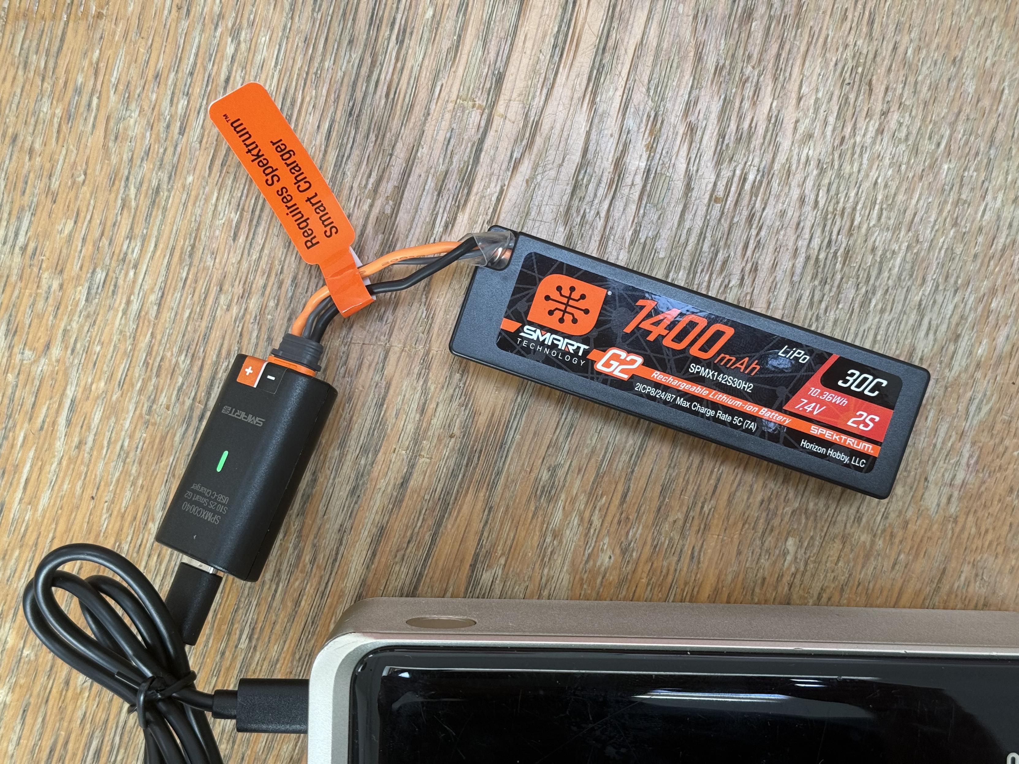 An aftermarket 3S, 2200mAh “Gens Ace” LiPo connected to their Imars Mini USB-C charger.